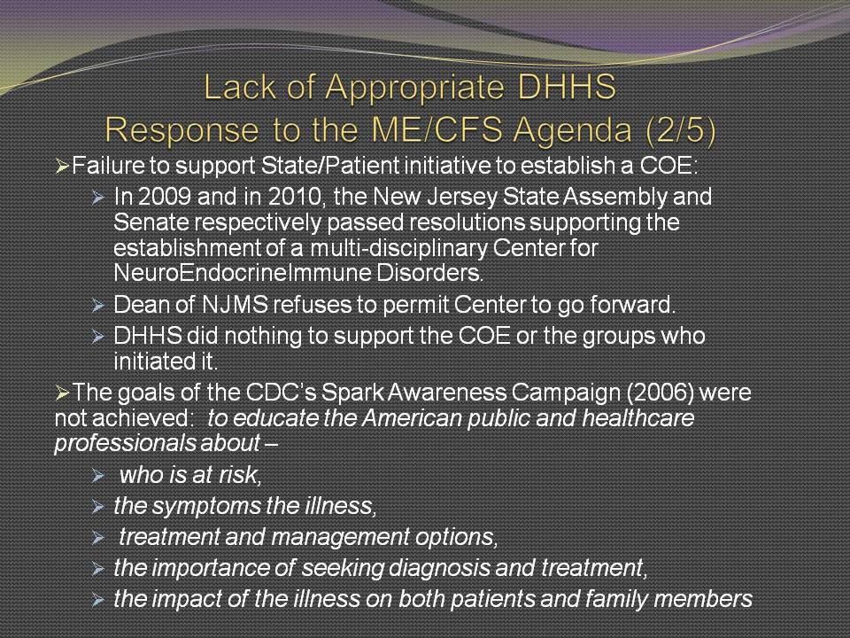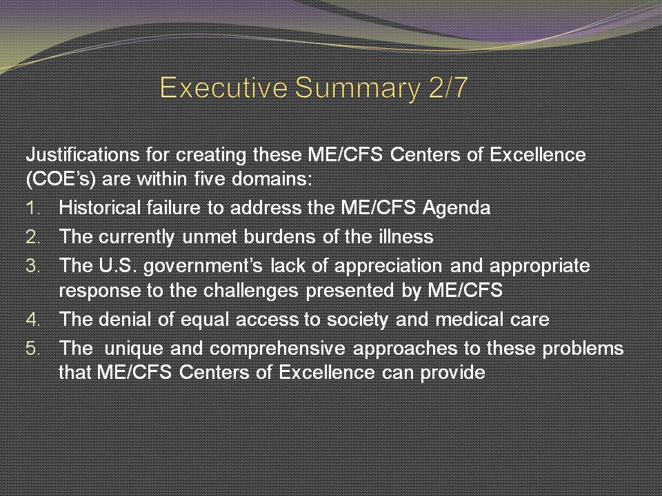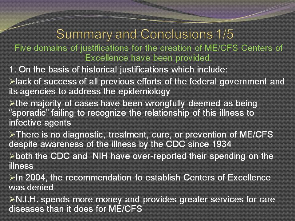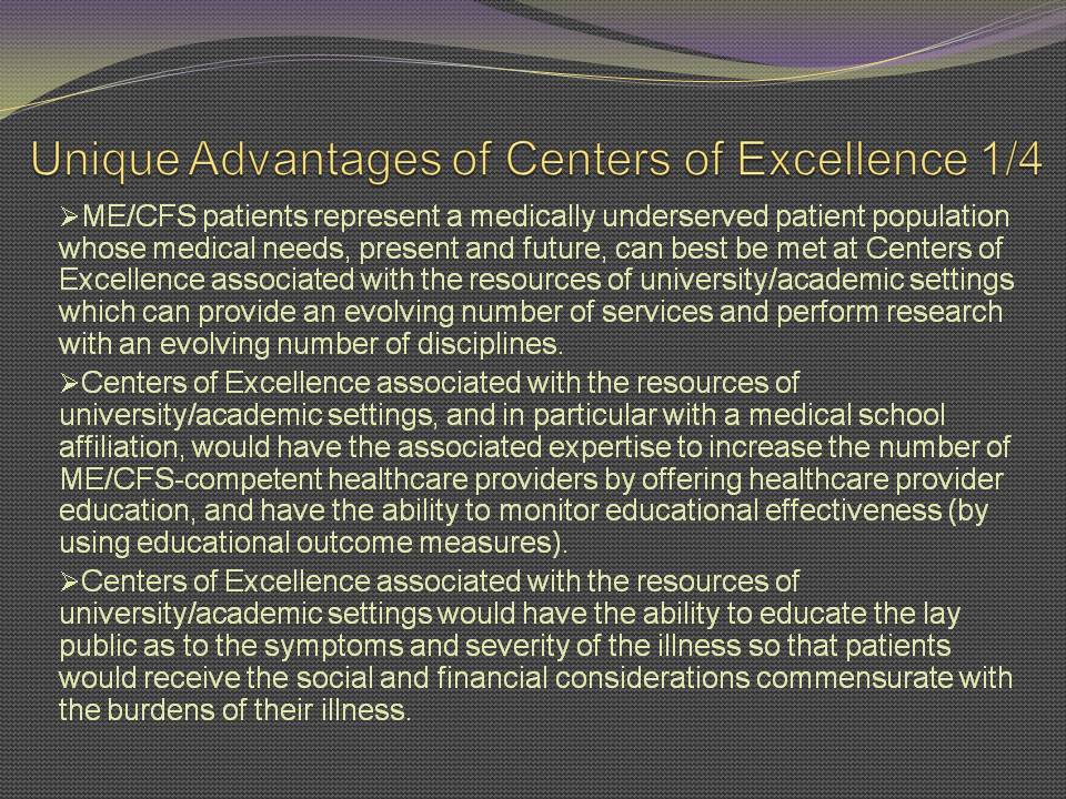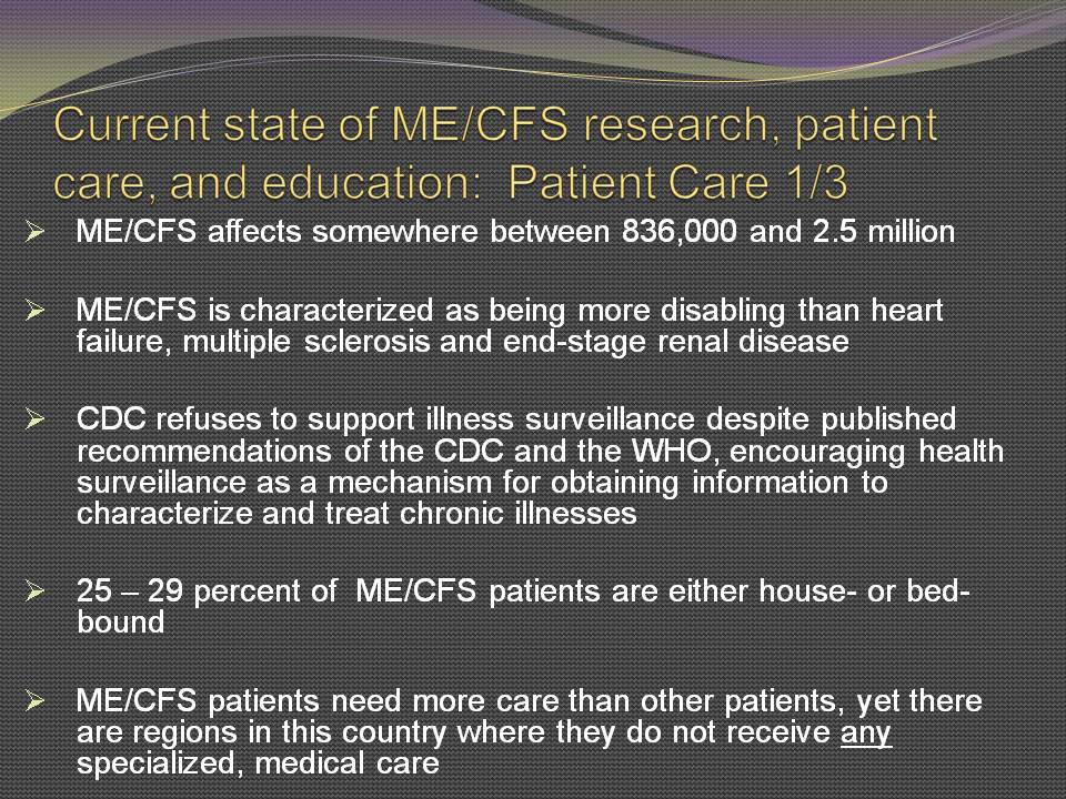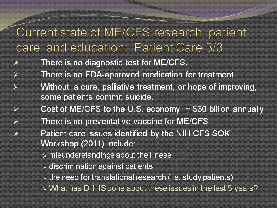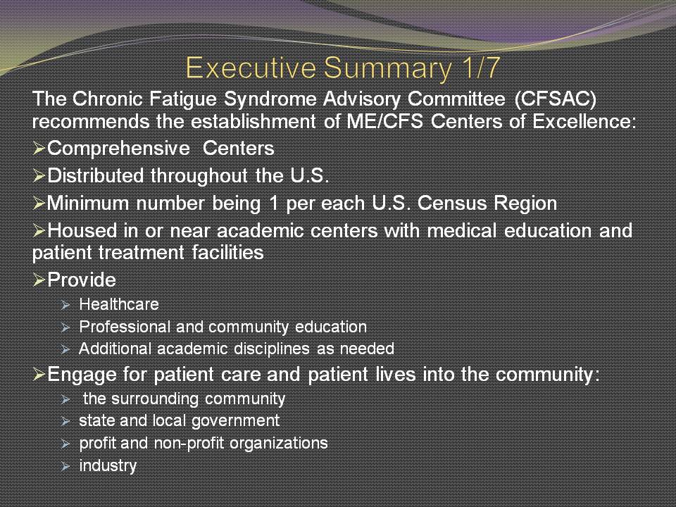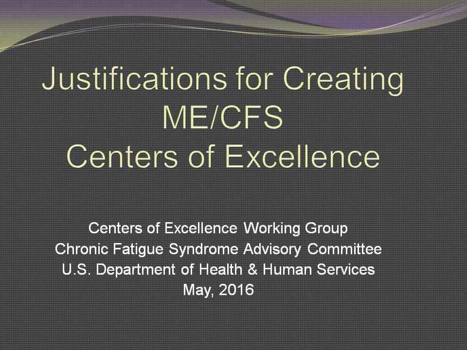 On May 17, 2016, the Chronic Fatigue Syndrome Advisory Committee, a U.S. Department of Health advisory committee whose purpose is to make recommendations to the U.S. Secretary of Health on matters related to ME/CFS (formerly known as Chronic Fatigue Syndrome), recommended to the Secretary the creation of 12 ME/CFS Centers of Excellence, each to be funded at a level no less than $1 million/year in direct costs, for no less than 5 years, requiring an investment of no less than $60 million in direct costs for these Centers and ME/CFS. It was further recommended that these Centers be geographically distributed throughout the United States to enable patient access by all ME/CFS patients, and that these Centers be comprehensive in the services they provide which include: ME/CFS research – both basic and clinical, ME/CFS patient care, education of both patients and the public, physician training so that more physicians are able to provide advanced care for patients, and social services for patients. For those patients who are unable to travel to one of these Centers, the recommendation stipulates that there will bedbound and housebound patient care provided via telemedicine in the communities in which they live. ME/CFS Centers of Excellence, while primarily targeted for ME/CFS research and patients, may include the study of related illnesses such as Lyme disease, fibromyalgia, Gulf War Illness, and Multiple Chemical Sensitivity. Such an inclusive strategy recognizes the similarities of pathophysiological mechanisms of illnesses which exhibit similar symptoms, and the efficiency in advancing the understanding of mechanisms contributing to these illnesses by studying more than one of them. ME/CFS Centers of Excellence have the potential to explore and reveal a new class of infectious disease agents: those viral and bacterial agents which produce chronic unwellness and disability by either persisting beyond the usual and recommended course of treatment and/or incapacitate the immune system such that it is no longer able to clear the infectious agent or agents from the human body. It is, therefore, to everyone’s benefit that such Centers be funded. For these reasons, we ask everyone to support the CFSAC’s recommendation for ME/CFS Centers of Excellence. The CFSAC approved the creation of 12 Centers based upon the provided justification of these Centers. While the public meeting of the CFSAC did not afford an opportunity to present the entire justification document as submitted, we present that PowerPoint below to demonstrate the numerous reasons and urgency for creation of these Centers. Our hope is that you will read the presentation and become a staunch supporter of these Centers. We ask that you inform your federal government representatives of your support for the creation of these Centers. Thank-you.