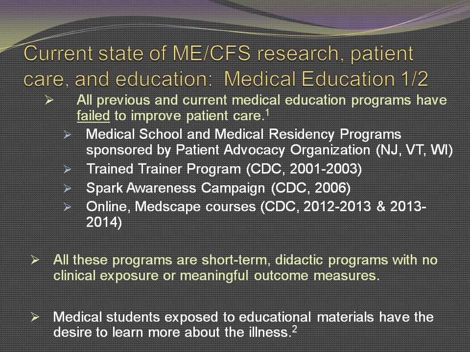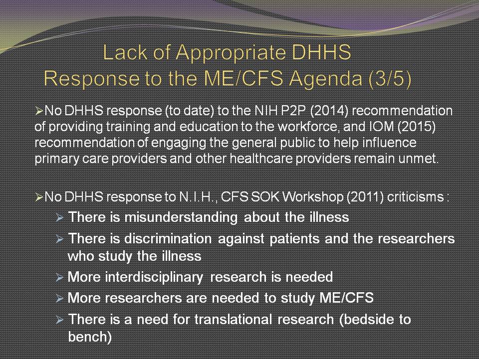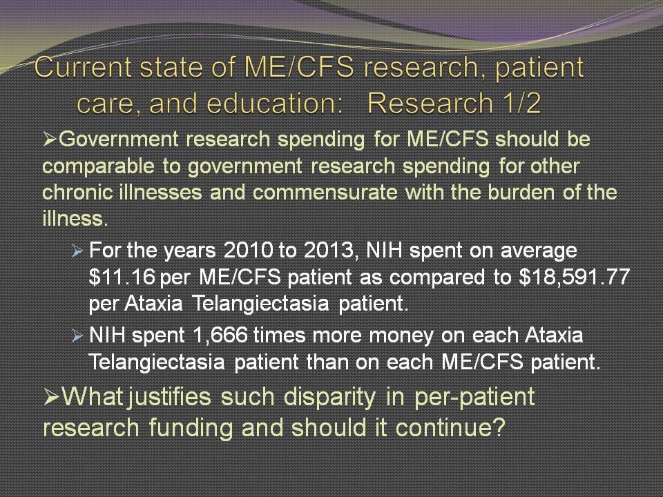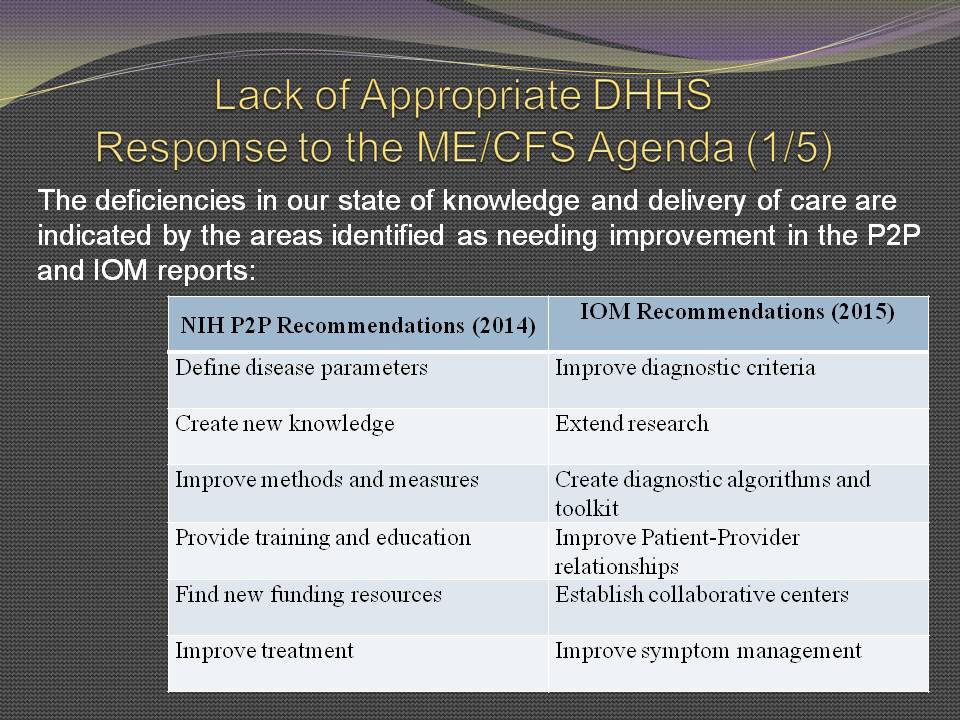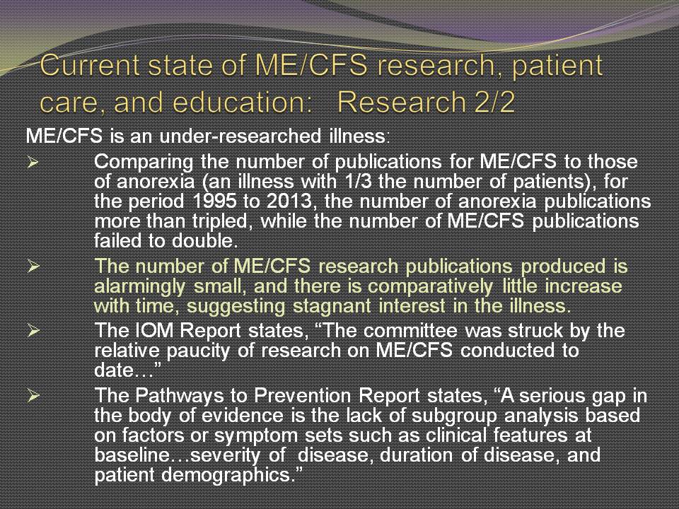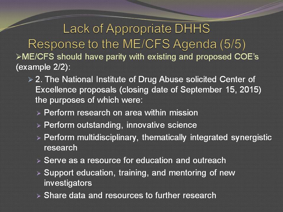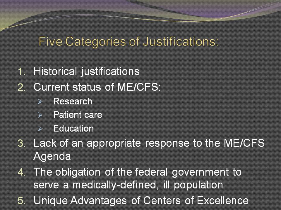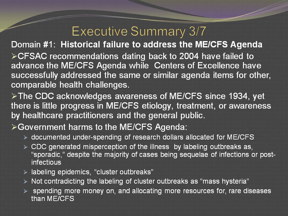 On May 17, 2016, the Chronic Fatigue Syndrome Advisory Committee, a U.S. Department of Health advisory committee whose purpose is to make recommendations to the U.S. Secretary of Health on matters related to ME/CFS (formerly known as Chronic Fatigue Syndrome), recommended to the Secretary the creation of 12 ME/CFS Centers of Excellence, each to be funded at a level no less than $1 million/year in direct costs, for no less than 5 years, requiring an investment of no less than $60 million in direct costs for these Centers and ME/CFS. It was further recommended that these Centers be geographically distributed throughout the United States to enable patient access by all ME/CFS patients, and that these Centers be comprehensive in the services they provide which include: ME/CFS research – both basic and clinical, ME/CFS patient care, education of both patients and the public, physician training so that more physicians are able to provide advanced care for patients, and social services for patients. For those patients who are unable to travel to one of these Centers, the recommendation stipulates that there will bedbound and housebound patient care provided via telemedicine in the communities in which they live. ME/CFS Centers of Excellence, while primarily targeted for ME/CFS research and patients, may include the study of related illnesses such as Lyme disease, fibromyalgia, Gulf War Illness, and Multiple Chemical Sensitivity. Such an inclusive strategy recognizes the similarities of pathophysiological mechanisms of illnesses which exhibit similar symptoms, and the efficiency in advancing the understanding of mechanisms contributing to these illnesses by studying more than one of them. ME/CFS Centers of Excellence have the potential to explore and reveal a new class of infectious disease agents: those viral and bacterial agents which produce chronic unwellness and disability by either persisting beyond the usual and recommended course of treatment and/or incapacitate the immune system such that it is no longer able to clear the infectious agent or agents from the human body. It is, therefore, to everyone’s benefit that such Centers be funded. For these reasons, we ask everyone to support the CFSAC’s recommendation for ME/CFS Centers of Excellence. The CFSAC approved the creation of 12 Centers based upon the provided justification of these Centers. While the public meeting of the CFSAC did not afford an opportunity to present the entire justification document as submitted, we present that PowerPoint below to demonstrate the numerous reasons and urgency for creation of these Centers. Our hope is that you will read the presentation and become a staunch supporter of these Centers. We ask that you inform your federal government representatives of your support for the creation of these Centers. Thank-you.