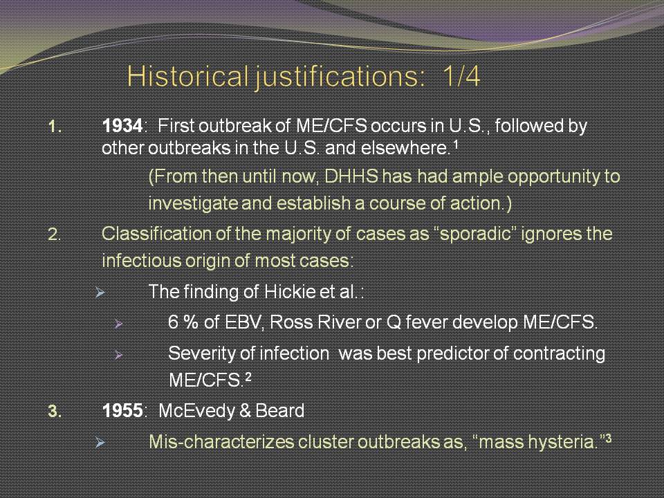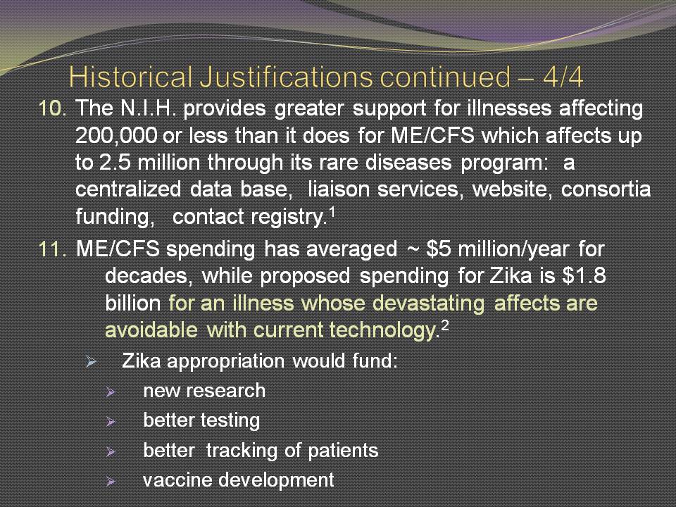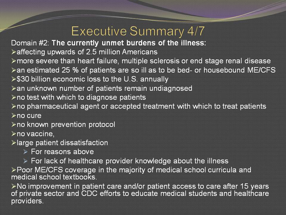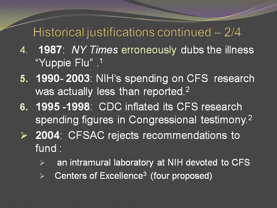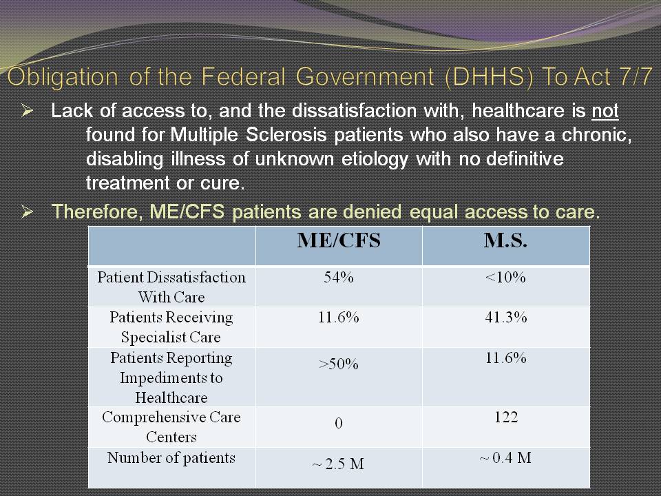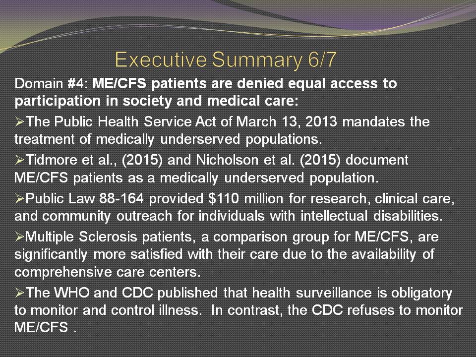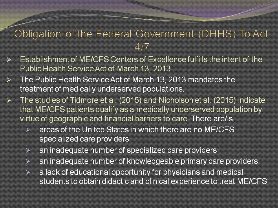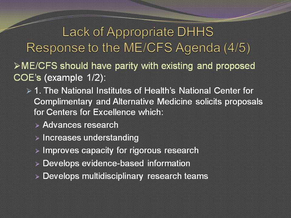 On May 17, 2016, the Chronic Fatigue Syndrome Advisory Committee, a U.S. Department of Health advisory committee whose purpose is to make recommendations to the U.S. Secretary of Health on matters related to ME/CFS (formerly known as Chronic Fatigue Syndrome), recommended to the Secretary the creation of 12 ME/CFS Centers of Excellence, each to be funded at a level no less than $1 million/year in direct costs, for no less than 5 years, requiring an investment of no less than $60 million in direct costs for these Centers and ME/CFS. It was further recommended that these Centers be geographically distributed throughout the United States to enable patient access by all ME/CFS patients, and that these Centers be comprehensive in the services they provide which include: ME/CFS research – both basic and clinical, ME/CFS patient care, education of both patients and the public, physician training so that more physicians are able to provide advanced care for patients, and social services for patients. For those patients who are unable to travel to one of these Centers, the recommendation stipulates that there will bedbound and housebound patient care provided via telemedicine in the communities in which they live. ME/CFS Centers of Excellence, while primarily targeted for ME/CFS research and patients, may include the study of related illnesses such as Lyme disease, fibromyalgia, Gulf War Illness, and Multiple Chemical Sensitivity. Such an inclusive strategy recognizes the similarities of pathophysiological mechanisms of illnesses which exhibit similar symptoms, and the efficiency in advancing the understanding of mechanisms contributing to these illnesses by studying more than one of them. ME/CFS Centers of Excellence have the potential to explore and reveal a new class of infectious disease agents: those viral and bacterial agents which produce chronic unwellness and disability by either persisting beyond the usual and recommended course of treatment and/or incapacitate the immune system such that it is no longer able to clear the infectious agent or agents from the human body. It is, therefore, to everyone’s benefit that such Centers be funded. For these reasons, we ask everyone to support the CFSAC’s recommendation for ME/CFS Centers of Excellence. The CFSAC approved the creation of 12 Centers based upon the provided justification of these Centers. While the public meeting of the CFSAC did not afford an opportunity to present the entire justification document as submitted, we present that PowerPoint below to demonstrate the numerous reasons and urgency for creation of these Centers. Our hope is that you will read the presentation and become a staunch supporter of these Centers. We ask that you inform your federal government representatives of your support for the creation of these Centers. Thank-you.