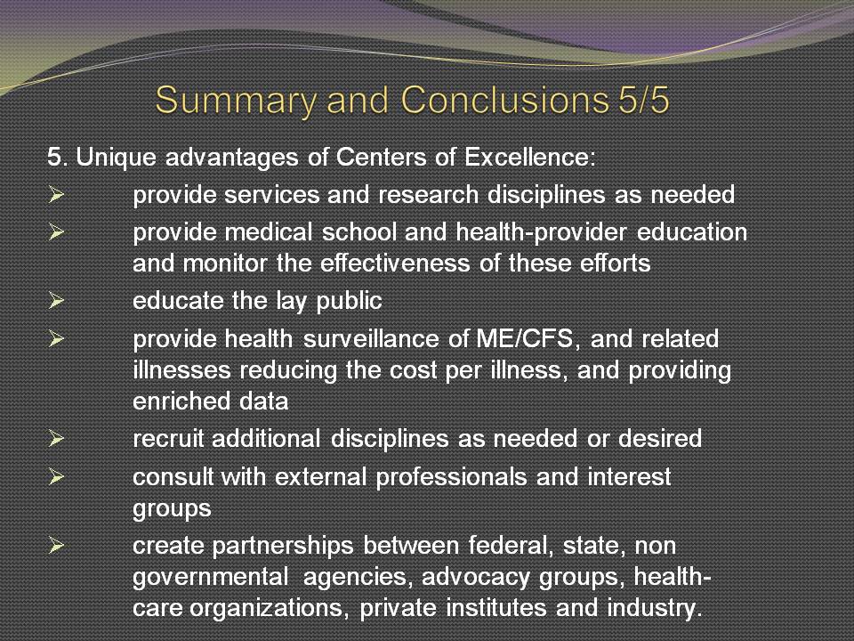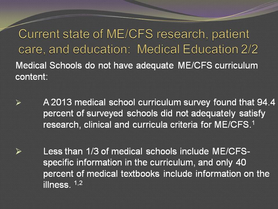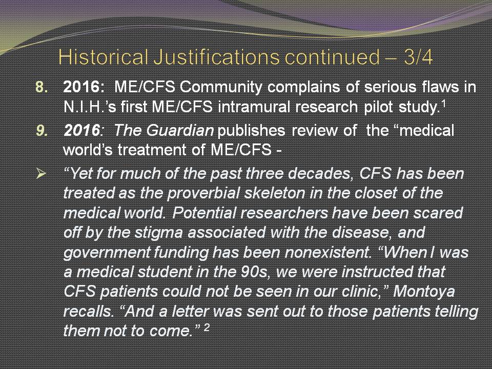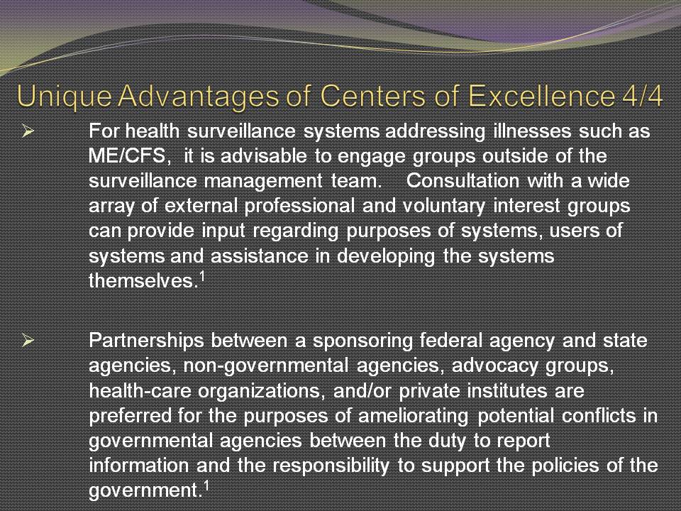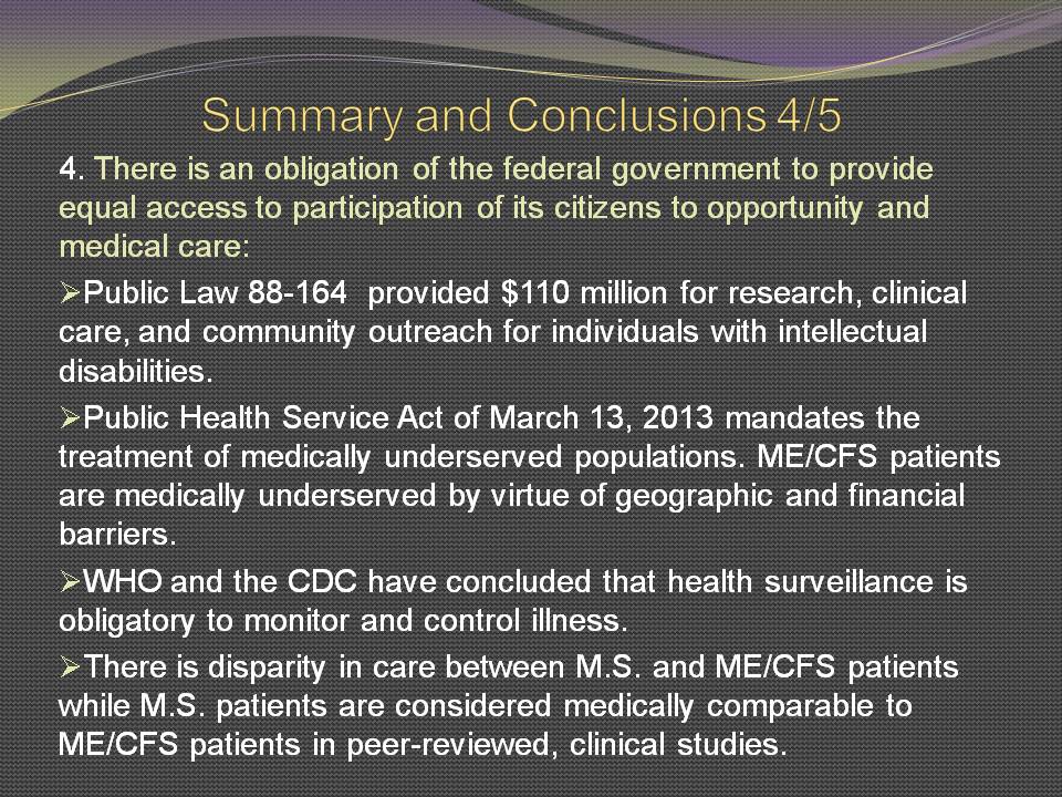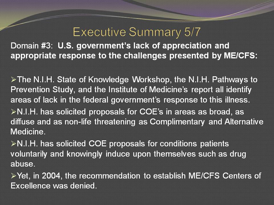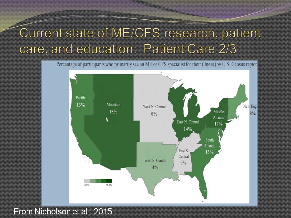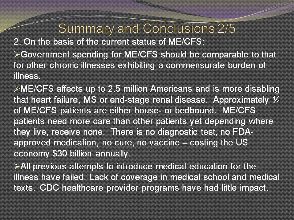 On May 17, 2016, the Chronic Fatigue Syndrome Advisory Committee, a U.S. Department of Health advisory committee whose purpose is to make recommendations to the U.S. Secretary of Health on matters related to ME/CFS (formerly known as Chronic Fatigue Syndrome), recommended to the Secretary the creation of 12 ME/CFS Centers of Excellence, each to be funded at a level no less than $1 million/year in direct costs, for no less than 5 years, requiring an investment of no less than $60 million in direct costs for these Centers and ME/CFS. It was further recommended that these Centers be geographically distributed throughout the United States to enable patient access by all ME/CFS patients, and that these Centers be comprehensive in the services they provide which include: ME/CFS research – both basic and clinical, ME/CFS patient care, education of both patients and the public, physician training so that more physicians are able to provide advanced care for patients, and social services for patients. For those patients who are unable to travel to one of these Centers, the recommendation stipulates that there will bedbound and housebound patient care provided via telemedicine in the communities in which they live. ME/CFS Centers of Excellence, while primarily targeted for ME/CFS research and patients, may include the study of related illnesses such as Lyme disease, fibromyalgia, Gulf War Illness, and Multiple Chemical Sensitivity. Such an inclusive strategy recognizes the similarities of pathophysiological mechanisms of illnesses which exhibit similar symptoms, and the efficiency in advancing the understanding of mechanisms contributing to these illnesses by studying more than one of them. ME/CFS Centers of Excellence have the potential to explore and reveal a new class of infectious disease agents: those viral and bacterial agents which produce chronic unwellness and disability by either persisting beyond the usual and recommended course of treatment and/or incapacitate the immune system such that it is no longer able to clear the infectious agent or agents from the human body. It is, therefore, to everyone’s benefit that such Centers be funded. For these reasons, we ask everyone to support the CFSAC’s recommendation for ME/CFS Centers of Excellence. The CFSAC approved the creation of 12 Centers based upon the provided justification of these Centers. While the public meeting of the CFSAC did not afford an opportunity to present the entire justification document as submitted, we present that PowerPoint below to demonstrate the numerous reasons and urgency for creation of these Centers. Our hope is that you will read the presentation and become a staunch supporter of these Centers. We ask that you inform your federal government representatives of your support for the creation of these Centers. Thank-you.